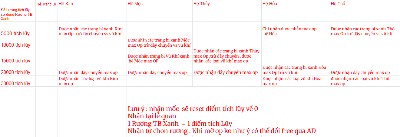 📢 Dưới đây là mốc quy đổi tích lũy sử dụng Rương TB Xanh :